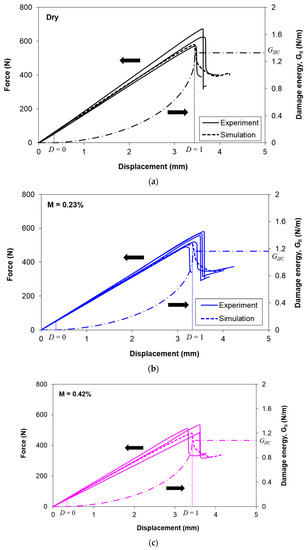 The cohesive parameters used at various moisture content levels are listed in Table 3. It is noteworthy that the GIIC are the estimated values from Equation (6) instead of the experimental values. The intention is to evaluate the accuracy of the predicated Kss(M) and GIIC(M) using the RPM.