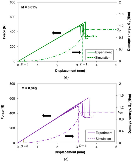 Figure 10 compares the experimental and numerical force displacement curves at each moisture content level. The maximum difference between the experimental and numerical slopes is 10%, which is found in dry conditions. This implies that the approach to estimate the elastic properties of the lamina as described in Section 4.2 is reliable. In addition, the difference between the experimental and numerical peak load is less than 12.5%, except for the case at M = 0.94%, where 18.5% is attained. This is because the GIIC values used in the simulation are the predicted values using Equation (6), and it is shown in Figure 4 that the fitted GIIC value at M = 0.94% is 15% lower than the experimental value. Therefore, it is reasonable to observe a larger difference in the peak load.