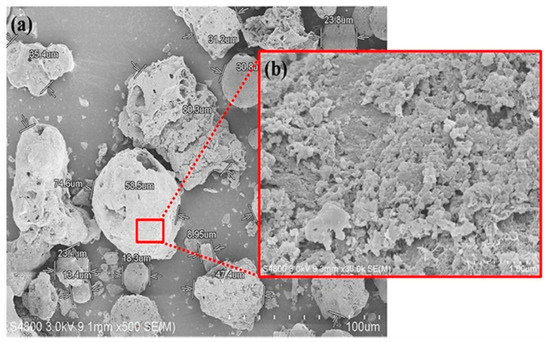 The OPA used in this research was obtained from Suksomboon Vegetable Oil Co., Ltd. in Chonburi province, Thailand. The raw OPA from the incineration of palm fiber was first ground and sieved through a 325 mesh sieve. The fine OPA powder obtained was then burnt at 550 °C in a furnace and left at room temperature, and followed by reflux in 2 wt% formic acid solution in order to remove any impurities (e.g., heavy metals). Thereafter, the chemical composition and physical properties of the OPA were determined as detailed in Table 1 and the fine OPA was found to consist of 81.55% SiO2. As can be seen from the scanning electron microscope (SEM) image in Figure 1, some of the OPA particles had a round shape while others were irregular with a rough and porous surface.