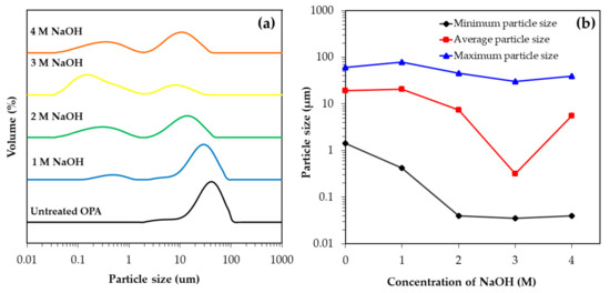 Change in particle size of OPA treated with NaOH at different concentrations followed by ultrasonication for 30 min: (a) particle size distribution and (b) the maximum particle size, average particle size and minimum particle size of treated OPA.