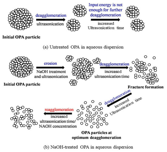 From the results, it can be clearly seen that the degree of deagglomeration of OPA after it was treated with NaOH, followed by 30 min of ultrasonication was greater than that of untreated OPA, which can be explained by the progressive reduction in the particle size of treated OPA being enhanced by the breakage of Si-O-Si bonds after pretreatment with NaOH [32] associated with ultrasonic cavitation effects, which caused the agglomerated particles to fragment into smaller particles. However, longer ultrasonication times allowed the reagglomeration of some broken NaOH-treated OPA particles into groups and the formation of large agglomerates [24]. It is worth noting that particle adhesion increases when the particle size decreases and similar results have been reported in earlier studies [25,26], with an initial rapid size reduction being followed by lower size reductions or even reagglomeration of the particles with continued ultrasonication.