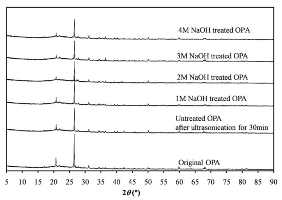 The XRD patterns of raw OPA, untreated OPA after ultrasonication for 30 min and OPA treated with NaOH at different concentrations with ultrasonication for 30 min were derived in order to examine their crystalline structure as shown in Figure 7. Clear quartz peaks appeared in all the diffractograms and those peaks were narrow and intense, indicating that this OPA was well-crystallized. Major diffraction peaks at 2θ were detected at angles of 20.8° (010), 26.6° (011), and 50.0° (012), which corresponded to α-quartz (SiO2), and accorded well with the chemical composition of the OPA (Table 1). In addition, the XRD pattern of the OPA powders after chemical treatment with NaOH and/or ultrasonication resembled the pattern of the original material, which implied an unchanged structure. This result is in agreement with a previous study [34], which reported that the crystalline structure of OPA remained unchanged after heat treatment and grinding. The average crystallite size is also shown in Table 5. It can be seen that the crystallite size of the untreated OPA slightly decreased after ultrasonication for 30 min and noticeably decreased in the NaOH-treated OPA after ultrasonication. The smallest average crystal size of the treated OPA was obtained using 3M NaOH treatment with ultrasonication, which reflected the diminishing degree of structural perfection of the material after NaOH treatment.