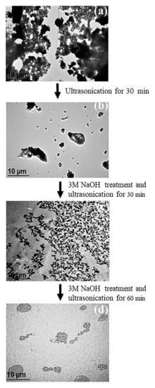 The deagglomeration and reagglomeration of the treated OPA particles during ultrasonication was confirmed by the TEM micrographs as shown in Figure 8. It can be seen that the original OPA without ultrasonication (Figure 8a) contained large particles and formed large agglomerates whereas, ultrasonication for 30 min of the untreated OPA caused the agglomerates to break and split into smaller agglomerates (Figure 8b). However, the deagglomeration during the ultrasonication of the OPA particles was more effective when it was accompanied by treatment with 3M NaOH (Figure 8c), which indicated that the siloxane bonds between the particle surfaces were not broken easily by ultrasonication without chemical treatment. Nevertheless, the reagglomeration of the broken treated OPA particles was clearly seen to increase the particle size when the ultrasonication was prolonged to 60 min (Figure 8d). This may be attributed to the strong interaction of the silanol groups among the particles.