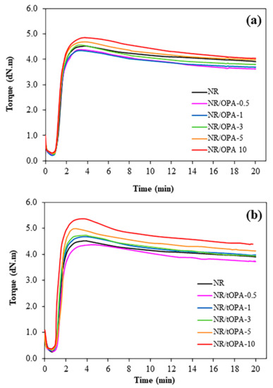 Cure curves of (a) NR/OPA and (b) NR/tOPA at various filler loadings.