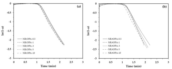 Plot ln[1 − α] versus time of (a) NR/OPA and (b) NR/tOPA at different loading in vulcanizing stage.