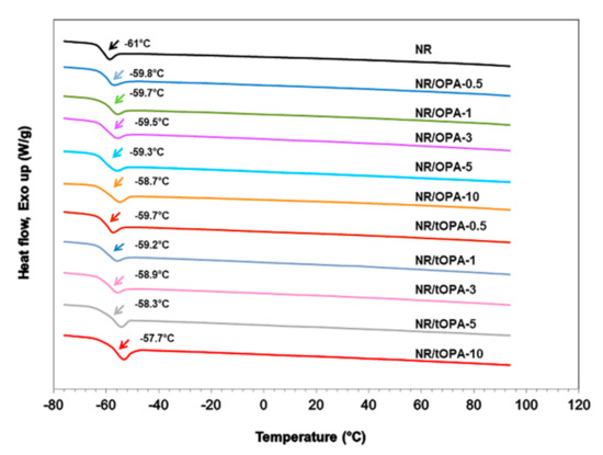 DSC thermogram of unfilled NR and NR/OPA and NR/tOPA at various filler loadings.