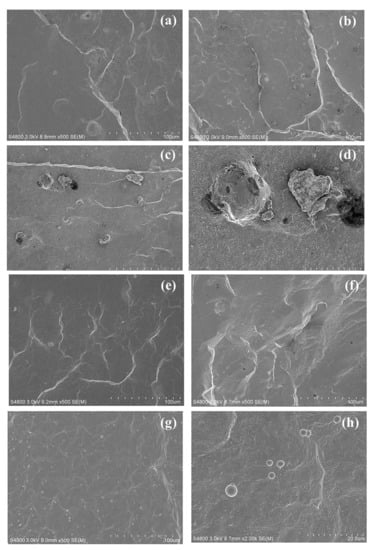 FE-SEM images of NR/OPA at different loading levels of (a) 1 phr, (b) 5 phr and (c) 10 phr at 500× magnification and (d) 10 phr at 2000× magnification and NR/tOPA at different loading levels of (e) 1 phr, (f) 5 phr and (g) 10 phr at 500× magnification and (h) 10 phr at 2000× magnification.