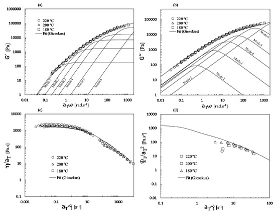 The shear viscosity curves for the three temperatures are displayed in Figure 4, which contains the two sets of data. The fit to the experimental data using the Bird–Carreau model is also shown. From the latter, the zero shear rate plateau () was obtained, so that the shift factors () needed for the construction of master curves could be calculated by