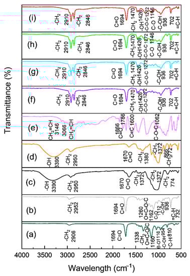 FT-IR spectra of the PBS/PBAT/TPS composites and PBS/PBAT/TPRH composites (a) PBS, (b) PBAT, (c) rice husk, (d) starch, (e) maleic anhydride, (f) TPRH48/12, (g) TPS48/12, (h) TPRH36/24, and (i) TPS36/24.