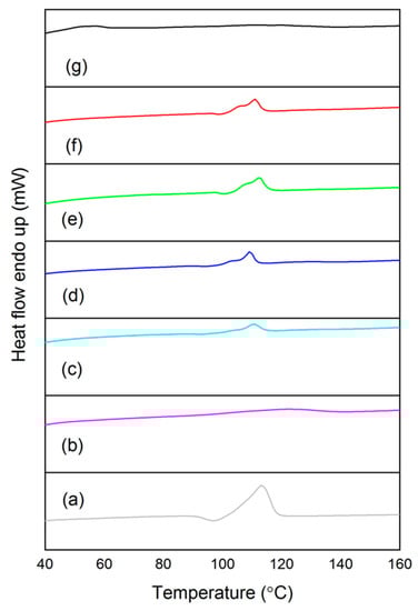 Second-heating Differential Scanning Calorimetry curves of (a) PBS, (b) PBAT, (c) TPRH48/12, (d) TPS48/12, (e) TPRH36/24, (f) TPS36/24, and (g) commercial PBAT.