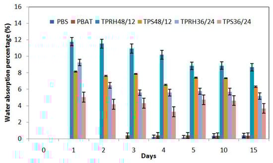 The PBS/PBAT/TPRH composites showed a larger water absorption capacity than bare PBAT and PBS. The water absorption rose tremendously in the first 24 h, and reached the saturation limit after 24 h of immersion. The TPRH48/12 and TPRH36/24 showed water absorption capacity at 11.78 and 9.24%, respectively after 24 h. The composite TPRH36/24 possessed a lower water absorption capacity than TPRH48/12 due to the intrinsic nature of PBS with high crystallinity. Moreover, the water absorption capacity of PBS/PBAT/TPRH was also found to be more than PBS/PBAT/TPS, which is an attribute to the lumen and cell wall of rice husk that provide more room for the water absorption [18]. Besides, the hydrophilic nature of rice husk that favors the intermolecular hydrogen bonding enhanced the water absorption of the film.