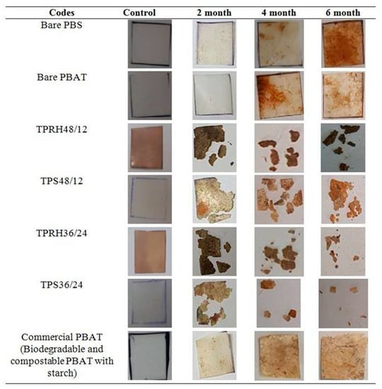 The entire composites showed a smoother surface before the degradation process. The mass change in the PBS/PBAT blended composites as a function of degradation time is shown in Table 5. The macroscopic appearance of biodegradation in PBS/PBS blended composites at different burying time is shown in Figure 8. Matting of the sample surface and color change was noticeable after the degradation process. The mass loss percentage increased with increasing burying time for the entire samples, which affirmed the biodegradation properties of PBS, PBAT, and PBS/PBAT blends. Progressive fragmentation was noticed in all the samples as they gradually degraded within 6 months. At the end of 6 months, only a small amount of residual debris remained. The color of the film gradually became brownish with increasing burying time. For TPS36/24, the mass loss percentage reached 97.06% after 6 months, which was in agreement with the results of Dammak et al. [55], indicating a fully biodegradable characteristic of this material. As for TPRH36/24, a similar result was obtained with a maximum mass loss of 92%. TPS48/12 and TPRH48/12 showed a much lower mass loss, indicating higher PBS content expedite the degradation process. The bare PBAT, PBS, and commercial PBAT showed mass loss at 8.9, 9.2, and 32.51%, respectively, after 6 months.