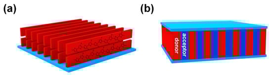 Adding active nanoparticles is another strategy to adjust the π–π interaction between rod blocks. Loudy et al. reported that the thin film morphologies of poly(3-hexylthiophene)-b-poly(ethylene glycol methyl ether methacrylate) (P3HT-b-PEGMA) are changed from fibrils structure into out-of-plane cylinders after incorporating gold nanoparticles with PEG ligands. This is because the crystallization of the rod block was destroyed, and the self-assembly is driven by nanophase segregation [123]. Ye et al. found that titanium dioxide (TiO2) nanoparticles (NPs) are preferentially confined in the P2VP domains when P3HT-b-P2VP mixed with nicotinic acid-modified TiO2 NPs. At the addition of TiO2 NPs to 40 wt % or higher, the morphologies of lamellar and cylindrical structures are disturbed. P3HT-b-P2VP/TiO2 hybrid materials exhibit a > 30 fold improvement in power conversion efficiency compared to the corresponding P3HT/P2VP/TiO2 polymer blend hybrid in a solar cell device [124].