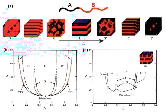In the simplest case of diblock polymers, as shown in Figure 2a, due to the immiscibility of two different blocks, they can self-assemble into different ordered morphologies including spheres (S), cylinders (C), bicontinuous gyroids (G), lamellae (L), etc. The phase separation behaviors of BCPs depend on three parameters: (1) f, the volume fractions of the A and B blocks (fA and fB, with fA + fB = 1); (2) N, total degree of polymerization (NA + NB = N); (3) χ, the Flory–Huggins interaction parameter between two polymer blocks. The driving force of the phase separation is the Gibbs energy change in the self-assembly process, which can divide into mixing enthalpy and mixing entropy. Unlike binary mixture of small molecules or polymer solutions, the mixing entropy of BCPs is usually very small. Thus, the product of N and the χ parameter, which describes the degree of thermodynamic incompatibility between the two chemically different polymeric blocks, governs the phase separation behaviors in BCP self-assembly. Several theories have been developed to predict the phase separation behaviors of BCP in bulk [25,34]. Nowadays, the self-consistent mean-field (SCMF) theory can predict the phase diagram of BCPs in good agreement with experimental data, as shown in Figure 2b,c. For example, symmetric diblock copolymers (fA = fB = 0.5) self-assemble into lamellar morphology when the product χN value is larger than the order–disorder transition values ((χN)ODT = 10.5) [26]. In addition, many nonclassical spherical packing phases, e.g., Frank–Kasper phases, have also been predicted by SCMF [35] and later experimentally discovered in recent years [36].