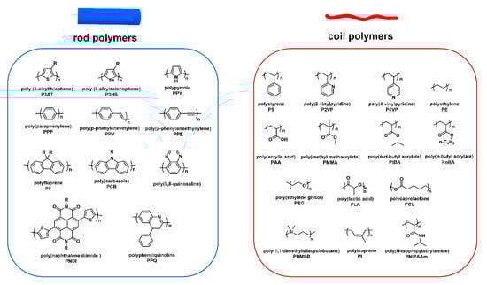 As mentioned above, cBCPs are divided into two categories, “rod–coil” (Figure 3b) and “rod–rod” (Figure 3c), based on the type of polymer blocks. “Rod–coil” cBCPs are composed of a rigid CP segment and a flexible polymer chain. Benefitting from the fast development of living polymerization techniques, the synthesis of “rod–coil” cBCPs are extensively studied, and people are able to synthesize various “rod–coil” cBCPs with different chemical components. Figure 4 shows representative chemical structures for rod and coil polymers. However, CPs are synthesized by metal catalyzed coupling reactions, which usually do not have the “living” feature. In this context, it is still very challenging to synthesize “rod–rod” cBCPs with well-controlled molecular weight and distribution. In this part, we will mainly focus on the synthesis of “rod–coil” and “rod–rod” cBCPs, and a few examples with different topological architecture will be also discussed.