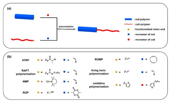 (a) The grafting-from approach from rod polymer and roil polymer; (b) representative functionalized chain end and monomer for different polymerizations.