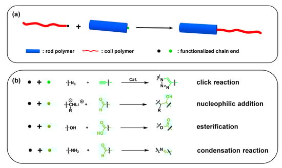 For the grafting-onto approach, a “coil” block and “rod” block are synthesized individually by different types of polymerization. Then, the as-prepared two blocks are functionalized with a specific group in the chain end, which can be coupled with each other (Figure 6a). A highly efficient “click” reaction is usually used for the grafting-onto approach. Polymers synthesized by ATRP are easily introduced to the azide group in the chain end by nucleophilic substitution reaction and then react with alkyne functionalized CPs by the copper (I) catalyzed “click” reaction to afford “rod–coil” cBCPs. For example, Li et al. synthesized poly(3-hexylthiophene)-b-poly(tert-butyl acrylate) (P3HT-b-PtBA) by ethynyl end functionalized P3HT and azide functionalized PtBA, in which PtBA was prepared by ATRP [55]. Lohwasser et al. modified the alkynyl group at the end of P3HT, which was followed by a click reaction with poly(4-vinylpyridine)(P4VP) polymerized by NMRP to obtain P3HT-b-P4VP [56]. Saejin et al. also used P3HT modified with an alkynyl group to react with azide functionalized PEG to obtain P3HT-b-PEG through a click reaction [57]. Other reactions are also employed for the grafting-onto approach, such as esterification, nucleophilic addition, condensation reaction, etc. For example, oligo(phenylene vinylene)-b-poly(ethylene glycol)(OPV-b-PEO) could be prepared through the esterification reaction between OPV with a carboxyl end and poly(ethylene glycol) monomethyl ether [58]. Olsen et al. reported the synthesis of poly(2,5-di(2′-ethylhexyloxy)-1,4-phenylene vinylene)-b-poly(1,4-isoprene) (PPV-b-PI). Benzene solution of aldehyde-terminated PPV was injected to quench an anionic polymerization of isoprene to afford the desired PPV-b-PI [59].