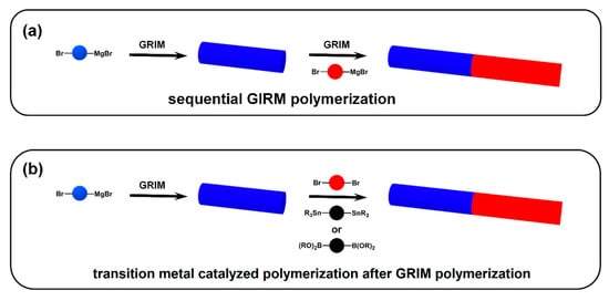 Compared to “rod–coil” cBCPs, the synthesis of “rod–rod” cBCPs is still very challenging, and many reported studies in the literature mainly focus on the poly(3-alkylthiophene) (P3AT) system prepared by Grignard metathesis (GRIM) polymerization (Figure 7a) [60,61,62,63,64,65,66]. GRIM polymerization, also known as Kumada catalyst transfer polymerization (KCTP), was developed by McCullough’s group in 1999 [67]. Due to its living nature, GRIM polymerization provides a versatile tool to synthesize regioregular poly(3-alkylthiophene) (P3AT) with well-controlled molecular weight, narrow distribution, and good chain-end functionality [68]. For example, Lee and coworkers used sequential GIRM polymerization to obtain poly(3-dodecylthiophene)-b-poly(3-(2-(2-(2-methoxyethoxy)ethoxy)ethoxy)methyl thiophene) copolymer (P3DDT-b-P3TEGT) [65]. GRIM polymerization can also be used to synthesize donor–acceptor type “rod–rod” cBCPs. Block copolymers poly(3-hexylthiophene)-b-poly(benzotriazole) (P3HT-b-PBTz) were prepared by the sequential monomer addition of benzotriazole and thiophene [66].