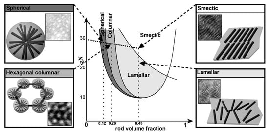 A lot of research has been published on the topic of “rod–coil” BCP self-assembly. “Rod–coil” BCPs show remarkably rich structural morphologies in bulk, such as lamellar phases, spherical, cylindrical, smectic, C-type smectic, O-type structure (HPL), hexagonal puck phases, hexagonally perforated layer structures, etc. [50,88,89,90,91]. Theoretical calculations also predict that A15 and gyroid phases could also exist in “rod–coil” BCPs. In the study of PPV-b-P4VP, Sary et al. found that they can form spherical, hexagonal columnar, lamellar, and smectic phases, based on volume fraction of PPV [92]. These results are consistent with theoretical predictions (Figure 8) [93]. However, for the conjugated “rod” blocks, they have a strong π–π interaction and are easy to crystallize and thus form fiber structures. The self-assembly of cBCPs is more complicated and different from “rod-coil” BCPs. The interaction between the anisotropic conjugated rods should be considered.