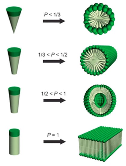 One key research area of cBCPs is their self-assembly behaviors in solution. Amphiphilic “rod–coil” cBCPs will self-assemble into various nanostructures depending on the molecular structures. Usually, amphiphiles with a hydrophobic chain and a hydrophilic head could self-assemble into spherical micelle, cylindrical micelle, vesicle, and lamellae (Figure 9), which can be predicted by the packing parameter, P = v/(a0lc), in which v is the volume of the hydrophobic chain, a0 is the polar head surface at the critical micelle concentration (cmc), and lc is the hydrophobic chain length [95]. Based on this theory, the aggregates of amphiphilic “rod–coil” cBCPs in solution could be tuned by changing the ratio of rod/coil. Kim et al. reported that a series of carbohydrate conjugate rod−coil amphiphiles with different rod/coil ratios are able to self-assemble into spheres, vesicles, and cylinders [96,97]. Selective solvent concentration is another parameter that affects the morphologies of amphiphilic “rod–coil” cBCPs in solution. For example, poly(phenylquinoline)-b-polystyrene(PPQ-b-PS) formed lamellar structures in dichloromethane/trifluoroacetic acid(DCM/TFA) (v/v = 1) mixed solvent and cylinders in DCM/TFA (v/v = 1/9) at room temperature. TFA is a good solvent for the conjugated PPQ block and protonates its imine nitrogen, while the coil PS block is insoluble in TFA [98]. Tung et al. reported that PF-b-PAA formed a tape-like structure when the coil part is short. When PAA block increased, various morphologies were observed with methanol concentration [42]. In addition to rod/coil ratios and selective solvent concentration, there are also other parameters that drive the self-assembly of “rod–coil” cBCPs in solution including pH values, temperature, the presence of additives and block compositions, etc. Several comprehensive reviews related to “rod–coil” cBCPs have been published [99,100,101,102,103,104].