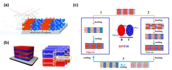 (a) “Edge-on” orientation of poly(3-hexylthiophene-b-3-(2-ethylhexyl)thiophene)s (P3HT-b-P3EHT) in thin film; (Reprinted with permission from Ref [62]. Copyright American Chemical Society); (b) “end-on” orientation of poly(3-dodecylthiophene)-b-poly(3-(2-(2-(2-methoxyethoxy)ethoxy)ethoxy)methyl thiophene) copolymer (P3DDT-b-P3TEGT) in thin film; (Reprinted with permission from Ref [65]. Copyright American Chemical Society); (c) three different self-epitaxial crystallization circles by controlling the heating process for poly(p-phenylene)-b-(3-hexylthiophene) (PPP-b-P3HT). (Reprinted with permission from Ref [111]. Copyright American Chemical Society).
