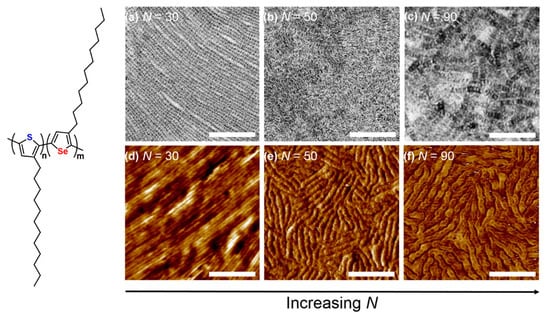 TEM micrographs and tapping-mode AFM phase images of P3DDT-b-P3DDS BCP-annealed thin films depicting lamellar structures ((a,d), N = 30), co-crystallized fibers ((b,e), N = 50), and a patchy fiber morphology ((c,f), N = 90). Scale bars are 200 nm. (Reprinted with permission from Ref. [114]. Copyright American Chemical Society).