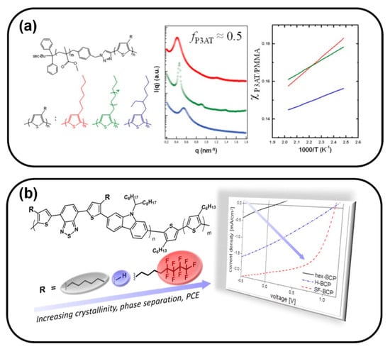 (a) Chemical structures of P3AT-b-PMMAs with different side chain length, Small-angle X-ray scattering results and temperature dependence of the Flory–Huggins interaction parameter between P3AT and PMMA segments for P3AT-b-PMMA; (Reprinted with permission from Ref. [118]. Copyright American Chemical Society); (b) chemical structure of PCDTBT-b-P3HT with different side chains and J–V characteristics. (Reprinted with permission from Ref. [119]. Copyright American Chemical Society).