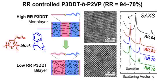 For P3AT-based “rod–coil” cBCPs, the morphologies in bulk or thin film can be modulated by controlling over the regioregularity (RR) of the P3AT block. Kim et al. designed a series of P3HT-b-P2VP with different RR. High RR P3HT-b-P2VP has a very strong interchain interaction and is preferential to crystalline, which makes it difficult to form an ordered nanostructure. In contrast, crystallization is inhibited in low RR P3HT-b-P2VP and well-ordered nanostructures are achieved, i.e., lamellar and cylindrical phases [120]. They also found that the domain space of poly(3-dodecylthiophene)-b-poly(2-vinylpyridine) (P3DDT-b-P2VP) can be tuned by regulating the RR of the P3DDT block (Figure 14) [121].