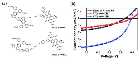 (a) Chemical structures of conjugated PTQI-b-PNDIS and donor–σ–acceptor type PTQI-b-PNDISL; (b) J–V characteristics of (red) PTQI-b-PNDIS, and (blue) PTQI-b-PNDISL. (Reprinted with permission from Ref. [75]. Copyright Royal Society of Chemistry).