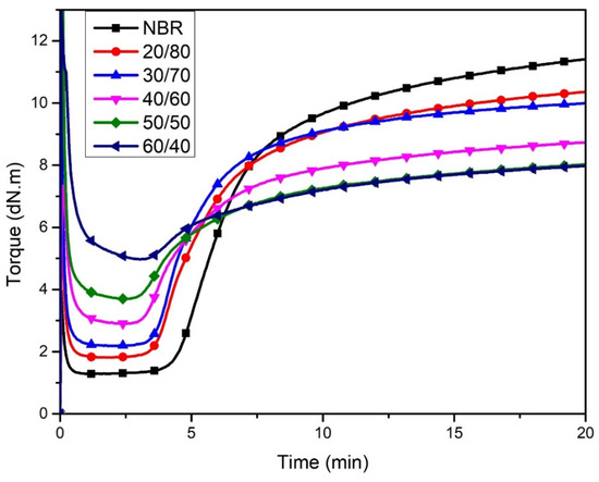 In contrast, there was a downward trend in the maximum torque MH when the content of WLF increased. Generally, the maximum torque MH reflects the cross-link density [25]. In this case, it could be the decline in cross-link density between the rubber chains in NBR phase, which may be caused by two main factors. Firstly, the WLF content is lower than that of NBR. Then, when the WLF content increased, the proportion of NBR declines respectively, leading to a decreased amount of polymer molecules reacting in the vulcanization. Secondly, the rigid network of leather fibers also provides the discontinuous matrix that is a limitation of the moving space of polymer molecules during the reaction process. Furthermore, it was found that the scorch time (ts2) values of the compounds with different WLF/NBR ratios were lower than that of the raw NBR. It could be attributed to the presence of reactive functional groups in leather fibers, which act as activators and accelerate the rate of reaction [26]. This phenomenon was further proved by the calculated parameter of the CRI shown in Table 2. The CRI of composites gradually increased by the upward trend of WLF content. The highest point of 33.11 min−1 was reached at 60/40 wt% of WLF/NBR ratio. It illustrated that the functional groups available in WLF could be an accelerator affecting not only ts2 but also optimum time (tc90) in the vulcanized NBR compound.