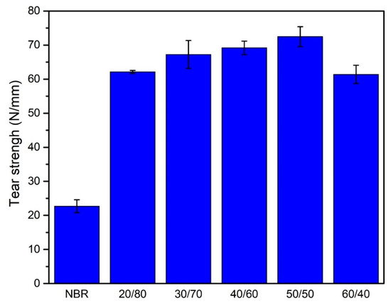 Figure 3 exhibits the effect of leather on the tear strength of the NBR composite. The trend of tear strength is quite similar to that of tensile strength when the leather content was raised. For the sample of NBR without leather, the tear strength was 22.7 N/mm. However, there was a three times increase in this value when the WLF/NBR ratio was just 20/80 wt%. From 30/70 wt% to 50/50 wt% of WLF/NBR ratio, the tear strength continuously went up and reached the highest value of 72.47 N/mm at 50/50 wt% of WLF/NBR ratio before falling to approximately 60 N/mm when WLF was further added. In comparison with the continuous NBR matrix, the presence of leather fiber considerably enhanced tear resistance. As in many previous publications, tear strength was directly related to crack growth [28,29]. Ferreia et al. have reported that the tear strength was remarkably improved when leather fibers were introduced in both NBR and Styrene-Butadiene Rubber [3]. Mese et al. also archived similar results with the Ethylene Propylene Dien Monomer rubber [17]. As a result, the fibers–fibers linking and fibers–rubber linking were contributed dramatically to the improvement of tear strength.