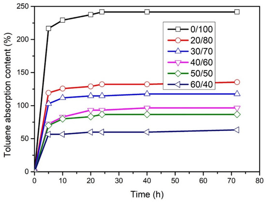 The effect of the WLF/NBR ratio on solution absorption of composites was evaluated with the capacity of absorbing toluene solution. The obtained results are presented in Figure 7. We found that while WLF proportion was increasing, there was a significant decline in toluene absorption content. Several factors, such as high resistance of WLF in a polar solvent, high resistance of nitrile rubber in oil, and aromatic hydrocarbon, can be used to explain this phenomenon. Therefore, with the presence of WLF in the developed composite materials, the solution resistance capacity of NBR was enhanced remarkably. The significant increase of the toluene resistance capacity of WLF/NBR composite when WLF/NBR content augmented also illustrates the good compatibility and dispersion of WLF in NBR matrix. The obtained results indicate the opportunity to develop new material with high oil and polar solvent resistance.