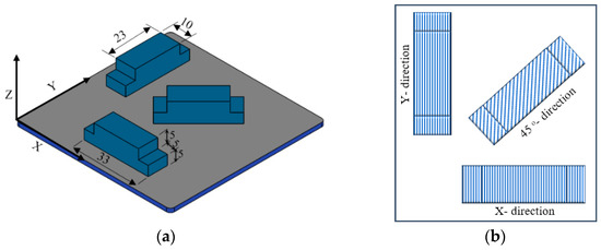 Test sample model: (a) Geometrical details and building orientation of the sample on the FDM building platform; (b) one direction linear infill hatching pattern.