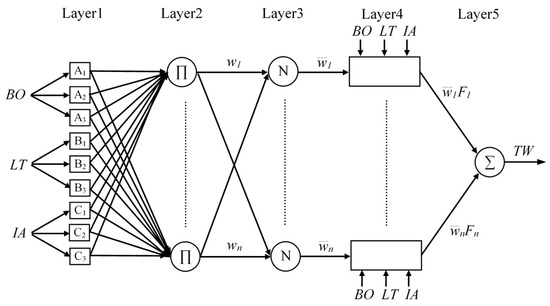 ANFIS uses five network layers to achieve the following fuzzy interpretation steps as shown in Figure 6. Where layer (1) is the input parameters, (2) is the fuzzy set database layer, (3) is the fuzzy rule base structure layer, (4) is the decision making layer, and (5) is the output defuzzification layer; more information are available in literature [34,35].