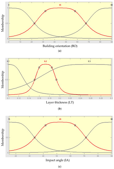 Membership functions of input parameters after training: (a) membership function of building orientation (BO), (b) membership function of layer thickness (LT), and (c) membership function of impact angle (IA).