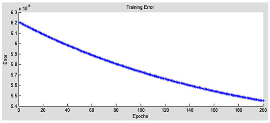 where yk is the required output and ok is the modeled one by the hybrid neural network. Throughout training, the output data set were utilized to perform 200 rounds of learning with an average error of 5.45 × 10−6 as shown in Figure 8.