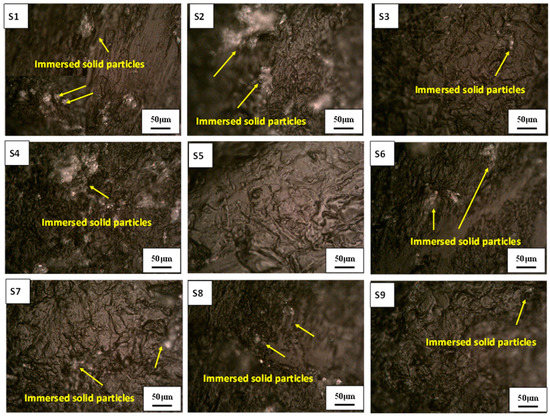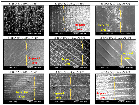 Optical microscopy of the FDMed PLA specimens after subjecting them to the slurry impacts. S1 (BO: Y, LT: 0.1, IA: 15°), S2 (BO: Y, LT: 0.2, IA: 45°), S3 (BO: Y, LT: 0.3, IA: 90°), S4 (BO: 45°, LT: 0.1, IA: 45°), S5 (BO: 45°, LT: 0.2, IA: 90°), S6 (BO: 45°, LT: 0.3, IA: 15°), S7 (BO: X, LT: 0.1, IA: 90°), S8 (BO: X, LT: 0.2, IA: 15°), and S9 (BO: X, LT: 0.3, IA: 45°).