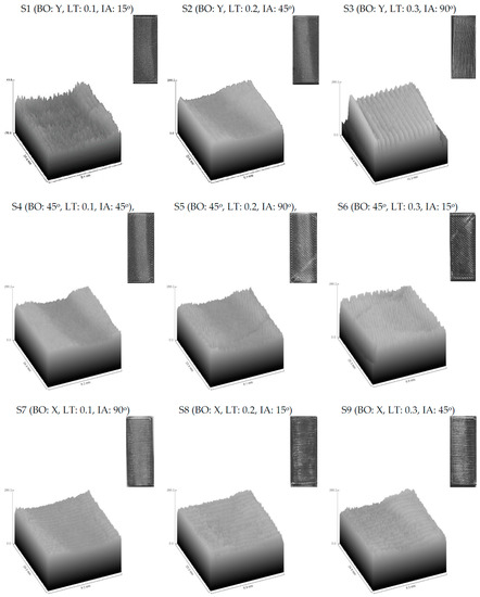 From previous work by authors [36] the manufactured specimens at different building conditions (Building orientation: BO, and layer thickness: LT) were tested under different slurry impact conditions (Impact angle: IA). The slurry impacts on the specimens caused weight gain for all the examined specimens at all building and testing conditions. The observed weight gain of the specimens was postulated to two reasons: (a) water absorption, and (b) the embedded sand particles in the surfaces of the specimens [36]. Figure 9 and Figure 10 show the impacted surface of the specimens scanned using an optical microscope (OM) and SEM, respectively. The OM images illustrate one of the reasons of the weight gain of the specimens after the slurry impact tests, i.e., the immersed fragmentation of the solid particles in the top surface of the specimens after the slurry impact test. Figure 10 illustrates the boarders between the impacted and unimpacted areas using SEM images. The first region is subjected to slurry impact and the other one is not. The areas that are subjected to slurry impacts are shown in white color. The peaks of the beads are almost smashed, and the surface of these areas is almost homogeneous without any severe hills or bottoms, whereas the darker areas are the original surface after the 3D printing process where the hills and bottoms of the printed beads are clear and the difference between them is high. This is also clear from the 3D surface profile images shown in Figure 11 extracted from the images of each sample after testing using the image analysis software (ImageJ, National Institutes of Health, USA) for a quantitative comparison of surface topography. Figure 11 also reveals that in specimens which have the highest LT (i.e., 0.3 mm in S3, S6, S9), the plastic deformation of these specimens in the impacted area is limited and, hence, resulted in higher surface roughness.