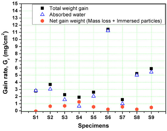 Gain rate in the weight of the specimens, absorbed water, and the net gain after impacting by 112.37 g of solid particles.