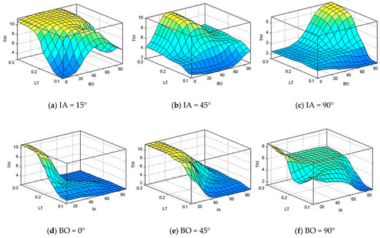 Total weight gain (TW) in relation to change of building orientation (BO) and layer thickness (LT), and impact angle (IA) at (a) IA = 15°, (b) IA = 45°, (c) IA = 90°, (d) BO = 0°, (e) BO = 45°, and (f) BO = 90°.