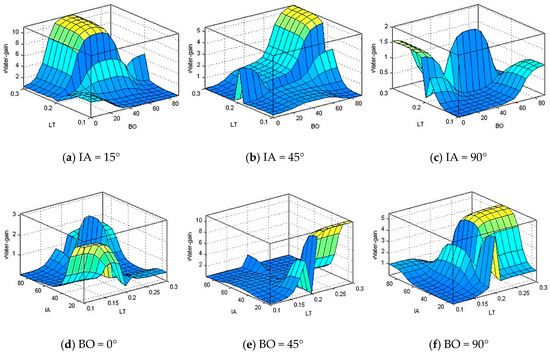 Water gain in relation to change of building orientation (BO), layer thickness (LT), and impact angle (IA) at (a) IA = 15°, (b) IA = 45°, (c) IA = 90°, (d) BO = 0°, (e) BO = 45°, and (f) BO = 90°.