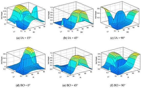 Net weight gain in relation to change of building orientation (BO), layer thickness (LT), and impact angle (IA) at (a) IA = 15°, (b) IA = 45°, (c) IA = 90°, (d) BO = 0°, (e) BO = 45°, and (f) BO = 90°.