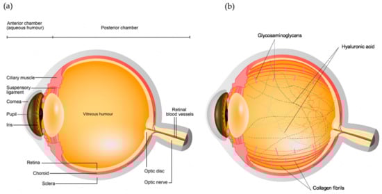 The eye primarily consists of two parts, an anterior and a posterior segment. The anterior segment is the smaller part of the eye which includes the cornea, conjunctiva, iris, pupil, aqueous humor and lens, while the posterior segment consists of sclera, choroid and retina surrounding the vitreous chamber filled with vitreous humor [3], as shown in Figure 1a. Vitreous humor is a transparent gel like matrix occupying two-third of the volume of the eye. The vitreous is highly hydrated comprising of over 98% of water, with 15–20 wt% of total water bound to proteins and Glycosaminoglycans (GAGs) [4,5]. The most abundant insoluble protein found in the vitreous is collagen, which builds a three-dimensional framework within the vitreous gel. Amongst the various collagen types present in the vitreous, type II collagen is found to be the most extensive in the vitreous (65%), followed by type IX (25%), type V/XI (10%), and type IV (<10%) [6], as shown in Table 1 and Figure 1b. On the other hand, GAGs constitute the other important component of the vitreous (Figure 1b). Three types of GAGs are present, mainly hyaluronic acid (HA) and with much lower concentration chondroitin sulfate (CS) and heparan sulfate (HS) [7]. HA is considered as a crucial element in determining the viscosity of the vitreous due to its massive size (molecular weight of 100,000–10,000,000 DA), while CS is a sulfated GAG and is generally linked to proteins as a part of a proteoglycan. It is present in the vitreous in the form of two proteoglycans: type IX collagen and versican. It helps in sustaining the structural integrity of the tissue [6,8]. Lastly, HS is present in small quantities in the vitreous and helps in maintaining adequate distance between the collagen fibrils [9]. The viscoelastic property of the vitreous is determined by the organization of hyaluronic acid between the interstices of long collagen fibrils suspended in the vitreous [10].