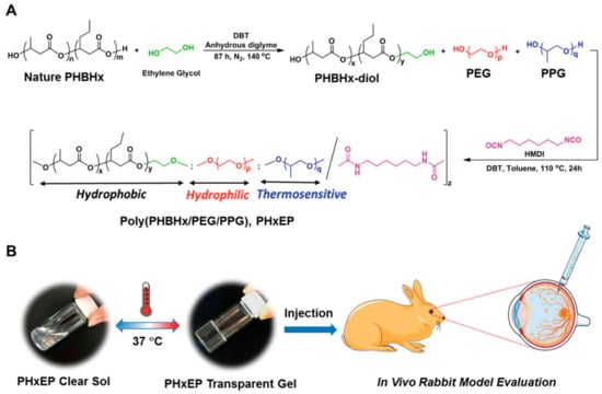 (A). Schematic illustration of the synthetic route of poly(PHBHx/PEG/PPG urethane); (B). hydrophobic PHBHx content is varied within the hydrogel, and that can change the gel properties from cloudy to transparent at 37 °C. The gels are then tested for in vivo eye application. Image adapted from Loh et al., (2019) and reprinted with permision from Royal society of chemistry.
