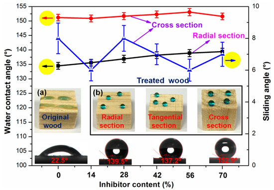 Water contact angle (WCA) and sliding angle (SA) on wood surface at different inhibitor contents. (a,b) Photographs of water droplets (dyed with methylene blue) on the original and modified wood (radial section, tangential section, and cross section).