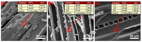 SEM combined with EDS analysis can observe the changes of wood morphology and chemical composition before and after modification. The SEM images of the radial section of the samples are depicted in Figure 5. The original wood surface was smooth and contained a few pipes of tree, as shown in Figure 5a. After surface modification (Figure 5b,c), we could see that the surface topography of wood had no significant changes, which indicated that the two-component package modification method did not influence the microstructure. The surface chemical elemental compositions of the wood before and after surface modification were determined via EDS analysis, and the results are presented as an inset in Figure 5a–c. The EDS analysis of the unmodified wood revealed that it contained C (64.23%) and O (35.77%) atoms, and the Si element was not detected. For the modified wood by two-component package method, the content of Si increased significantly from 4.03 to 10.16% as the inhibitor content increased. This is due to the increase of the inhibitor content, which makes more PMHS chains react to the wood surface, so the silicon content will increase. In short, combining FTIR, XPS, and the SEM-EDS analysis, we could further speculate that the PMHS chains had grafted onto the wood surface. Thus, the wood had good hydrophobicity.