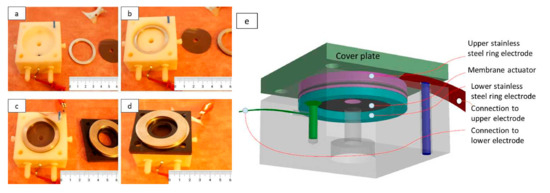 Reliable measurements of membrane actuators require a specific holder to fulfill certain requirements of easy handling, clamping the membrane actuator without a short circuit and avoiding leakage of electrolytes. In order to avoid complicated arrangements, a simple approach with stainless steel rings on either side of the membrane gave the best results. Figure 1a–d show the step-by-step assembly of the device with an M2 actuator, with Figure 1e as the schematic of the device.