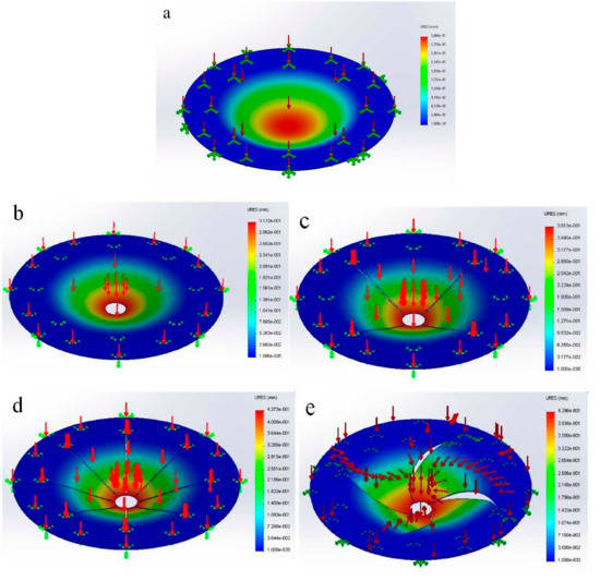 The responses of the membranes to uniform vertical pressure (0.7 kPa) were simulated using finite element analysis as implemented in Solidworks [30], applying the large displacement solution. The Timoshenko beam model adapted to circular plates was applied, with the simplifications of isometric membranes and limiting to small trains to endure linearity between stress and strain [31]. Similarly to the experiments, the membranes in diameters of 4 cm were considered, with 1 cm fixed (the same as the stainless steel rings’ positioning in the experiments). Figure 3a–e show the simulated heatmaps of maximum bending displacements of membranes M1–M5.