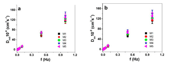 Diffusion coefficients obtained from Equations (2) and (3), from square wave potential step measurements in LiTFSI-aq electrolyte in a potential range of ± 0.7 V. From the membrane actuators M1 (■), M2 (●), M3 (♦), M4 (★) and M5 (◄), the diffusion coefficients upon reduction Dred are shown in (a) and those upon oxidation Dox are presented in (b) against the applied frequency f.