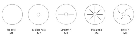 Membrane designs. No patterning: M1; patterned: M2 (middle hole, diameter 4 mm), M3 (a hole and four straight cuts with a 2 mm space between the hole and the cuttings), M4 (a hole and 8 straight cuts), M5 (a hole and spiral cuts).
